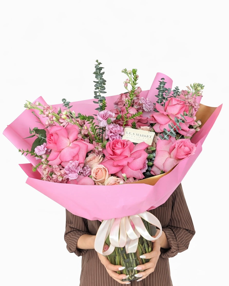 A lush blush-toned garden wrap filled with romantic seasonal blooms.
